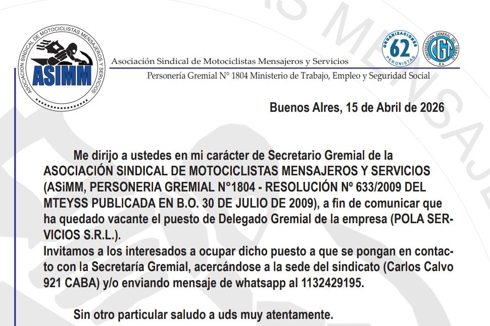 Comisión Interna Urbana Mensajería Buenos AIres, 15 de Abril de 2026 Me dirijo a ustedes en mi carácter de Secretario Gremial de la ASOCIACIÓN SINDICAL DE MOTOCICLISTAS MENSAJEROS Y SERVICIOS (ASiMM, PERSONERIA GREMIAL N°1804 - RESOLUCIÓN Nº 633/2009 DEL MTEYSS…